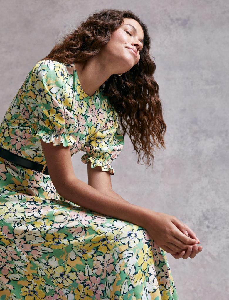 Multi Renk Çiçek Desenli Midi Elbise